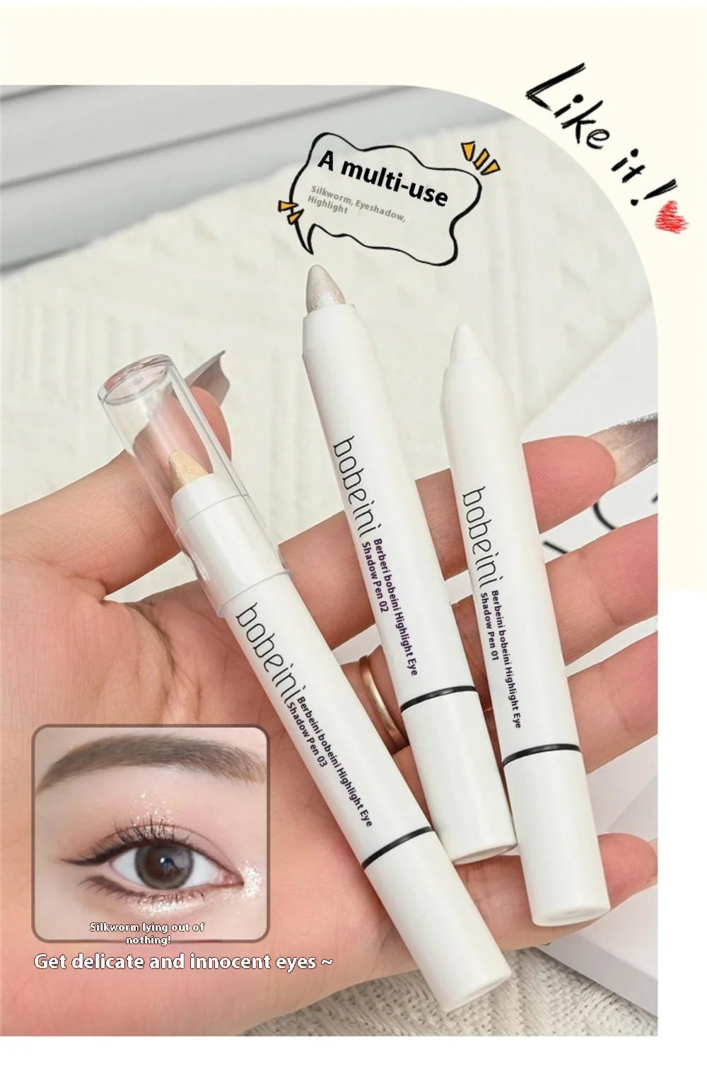 Pearlescent version: Micro shimmering pearl particles naturally refract light, brighten tear troughs and silkworms, create a "bang bang" water light sensation, and instantly make the eyes lively.